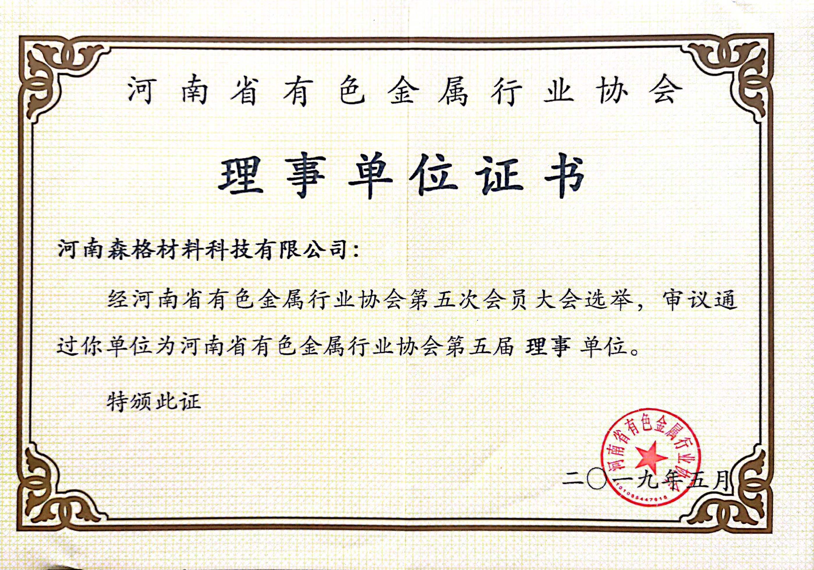 河南省有色金屬行業(yè)協(xié)會理事單位證書