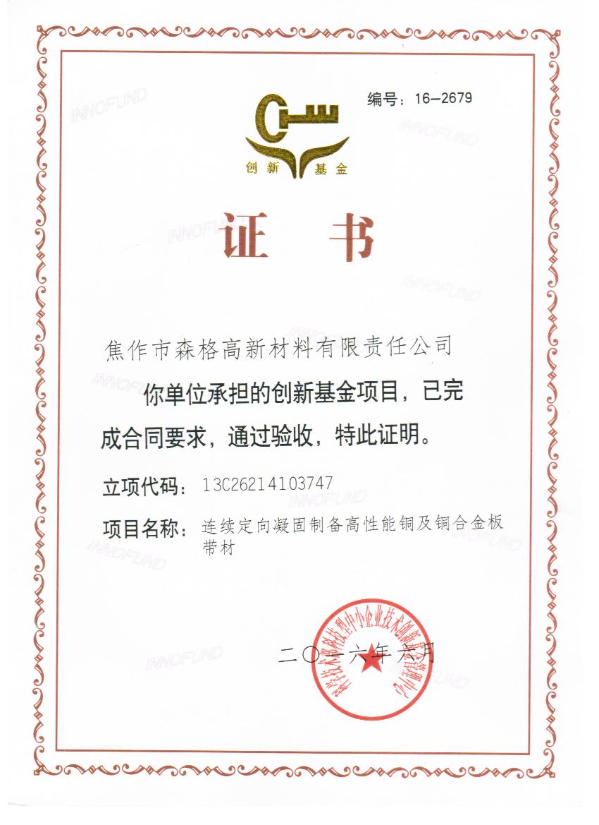 科技型中小企業(yè)技術(shù)創(chuàng)新基金立項(xiàng)證書(shū)“連續(xù)定向凝固制備高性能銅及銅合金板帶材”