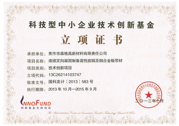科技型中小企業(yè)技術(shù)創(chuàng)新基金立項證書“連續(xù)定向凝固制備高性能銅及銅合金板帶材”